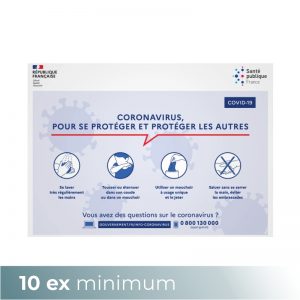 Ces panneaux indiquent les principales mesures à prendre pour éviter la propagation du virus dans les lieux publics. Ils mettent notamment l’accent sur l’importance du lavage des mains, et la manière de ne pas transmettre le virus par l’air. Ils rappellent également la nécessité d’éviter les contacts, comme le traditionnel serrage de main. Complétés par des pictogrammes clairs, ils sont très instructifs et lisibles. Ils peuvent ainsi être lus par tout un chacun. En général, les formats portraits peuvent être affichés dans des vitrines, et les formats paysage peuvent être placés dans des lieux de passage.