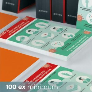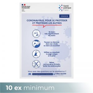 En format A5 ou A6, ils sont très pratiques et peuvent être placés sur un comptoir, par exemple. Ainsi, vous pourrez les mettre à la disposition de votre clientèle et de vos salariés, pour les informer en tout temps des règles à respecter. Ce type d’affiche conviendra autant à un commerce, qu’à un cabinet médical ou même un hôpital. Ils peuvent même être affichés dans un bureau ou un entrepôt, afin d’informer tout un chacun sur les procédures à suivre pour limiter la transmission.