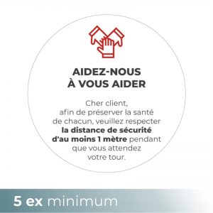 Vous avez déjà équipé votre établissement avec des autocollants sol pour permettre à vos clients de respecter la distanciation sociale ? Alors, vous pourriez avoir également besoin d’adhésifs pour vitrine. Ils se placent à hauteur de regard de vos clients et restent visibles depuis l’extérieur. Ainsi, ils vous aideront à les informer quant aux nouvelles mesures prises pour lutter contre le COVID 19.